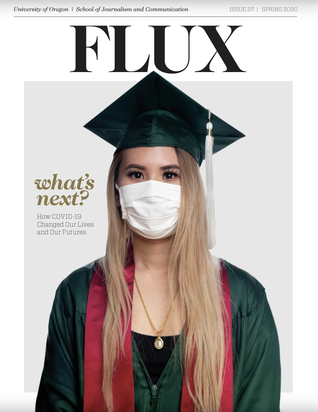 THE PUBLICATION - FLUX Magazine is University of Oregon’s award-winning, capstone publication through the School of Journalism & Communication. The Spring 2020 issue, titled “Uncertainty” due to the rise of the COVID-19 pandemic and other unprecedented times, received 15 Gold Circle Awards from the Columbia Scholastic Press Association, including eight national design awards. This publication was produced entirely over zoom due to the pandemic.
