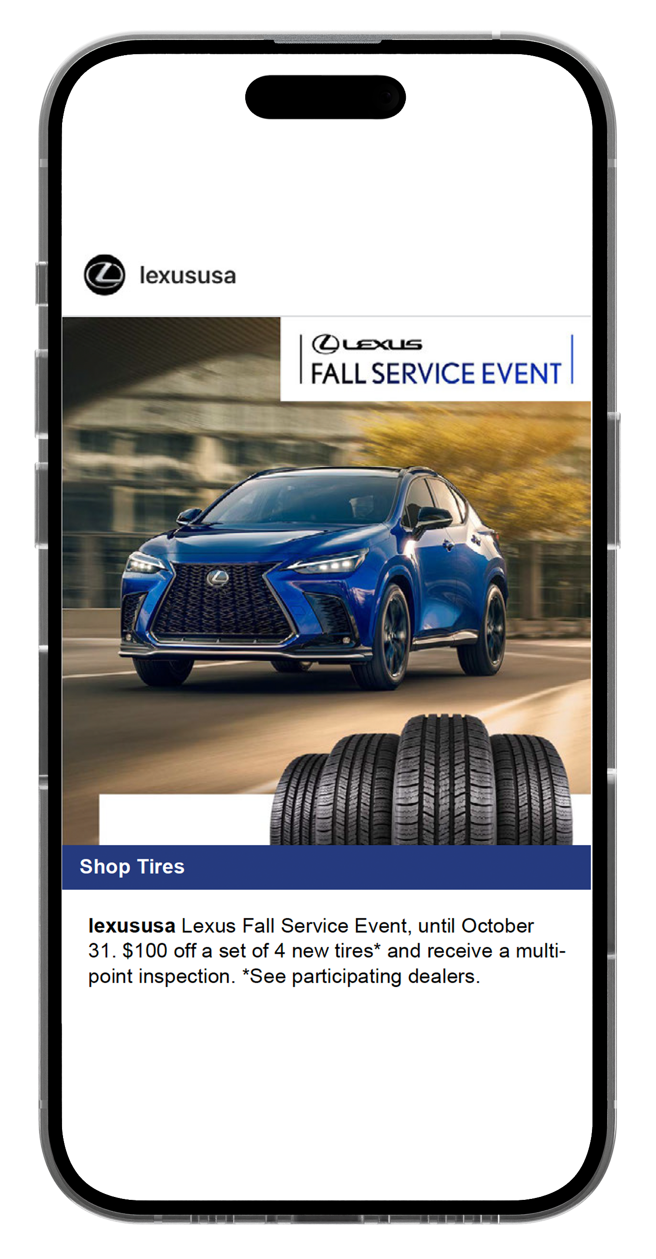 Optimizing the customer journey by focusing on call to actions that drive to LexusTireCenter.com.