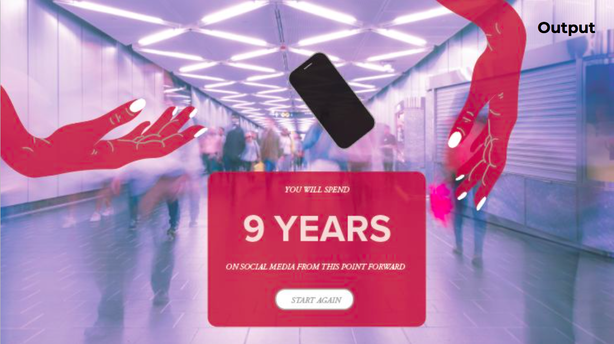 With the newest IOS update allowing for individuals to track and access their weekly social media usage to the hour, we were inspired to tackle this data and mold it into the form of a website mockup. Our website will calculate approximately how many remaining years of an individual’s life will be spent on social media. This “oh shit” moment was founded on the idea that the average individual is likely an avid social media user (like us) in need of a wakeup call. It’s a call to action, forcing us to consider how we are currently spending our time versus how we could be spending our time. Making social change starts with a simple changed behavior.
